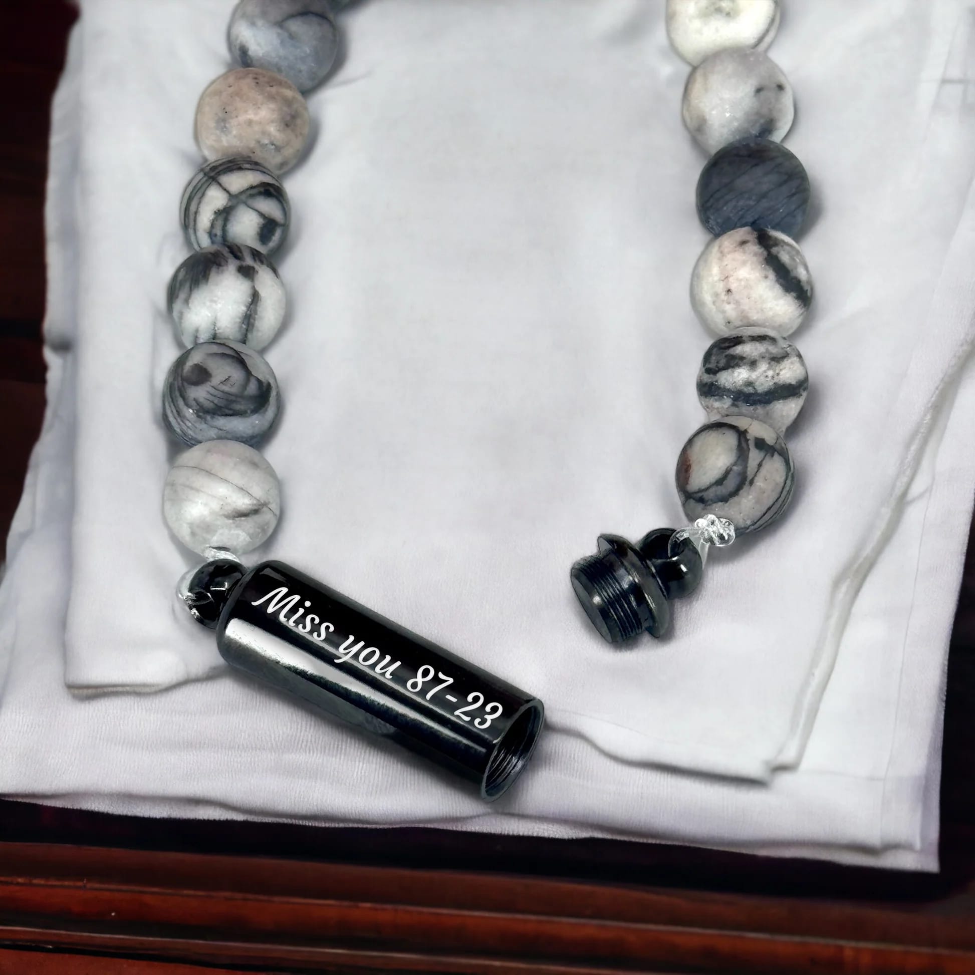 Draag de herinnering aan een dierbare altijd bij je met onze As-Armband Kralen. Dit unieke sieraad biedt niet alleen een elegante uitstraling, maar ook een discrete manier om as te bewaren in een subtiele askamer. De zilverkleurige of zwarte askamer kan bovendien worden gepersonaliseerd met een gegraveerde tekst, waardoor je armband een unieke en persoonlijke betekenis krijgt.