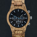 Het mechanische uurwerk houdt de koers betrouwbaar bij, terwijl de olijfhouten kast een warme, natuurlijke uitstraling geeft. Lichtgewicht en verstelbaar, blijft het horloge strak op de pols – klaar voor elke missie.