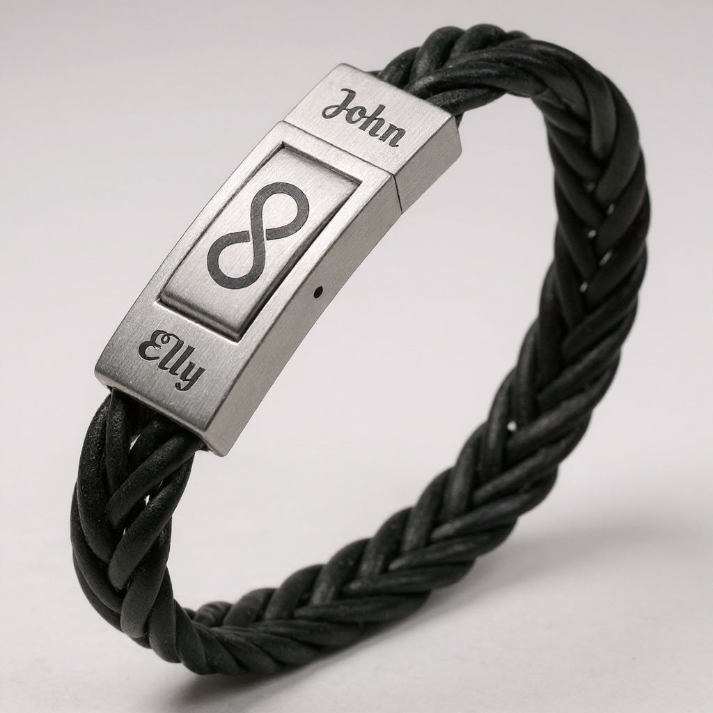 Bestel nu onze drukschakelaar met eigen tekst gravure - gevlochten zwart leer en draag binnenkort jouw persoonlijke statement om je pols!